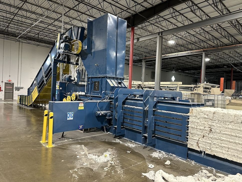 American Baler #DC6348-8T30, automatic tie baler with conveyor, dual 30 HP motors, 8" cylinder