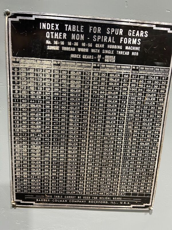 Barber-Colman #16-16, single thread index worm, hob shift, rapid traverse, Dwell, 1979