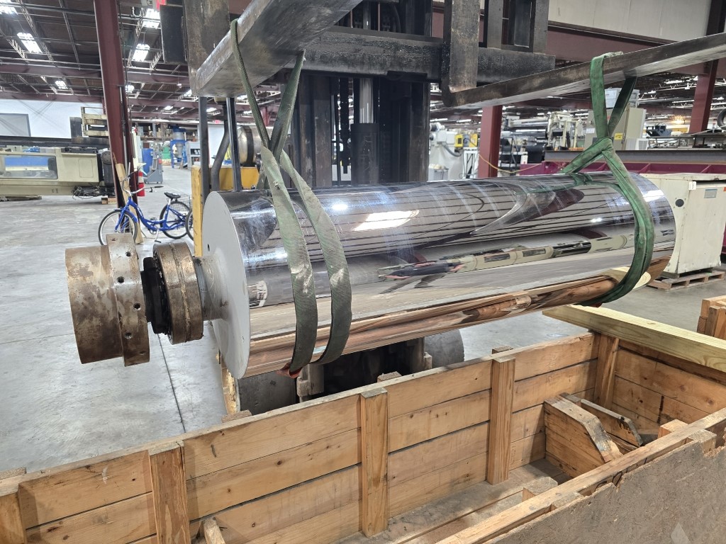 - 56" Wide X 18" Dia. Battenfeld Gloucester Horizontal Sheet Stack, Independently Driven Rolls, 3 Matte Rolls, 2 Chrome Rolls, Driven By Radicon 250:1 Right Angle Gearbox By 3 HP Marathon Motors, New In 1996, S/N 37350-15, Hydraulic Roll Pressure