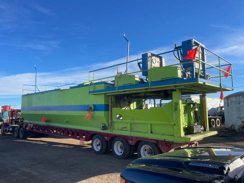 Liquid enters the system by an external feed pump (not included) and enters the feed zone of the tank where polymer is injected. Solids then settle to the bottom of the tank where the continuous chain and paddle system drags solids to the one end where 2 x 2 inch trash pumps are located. The 2 inch feed pumps feed the centrifuges. Solids gravity discharge out of the bottom of the centrifuges, liquid is also gravity discharged out of the bottom.
