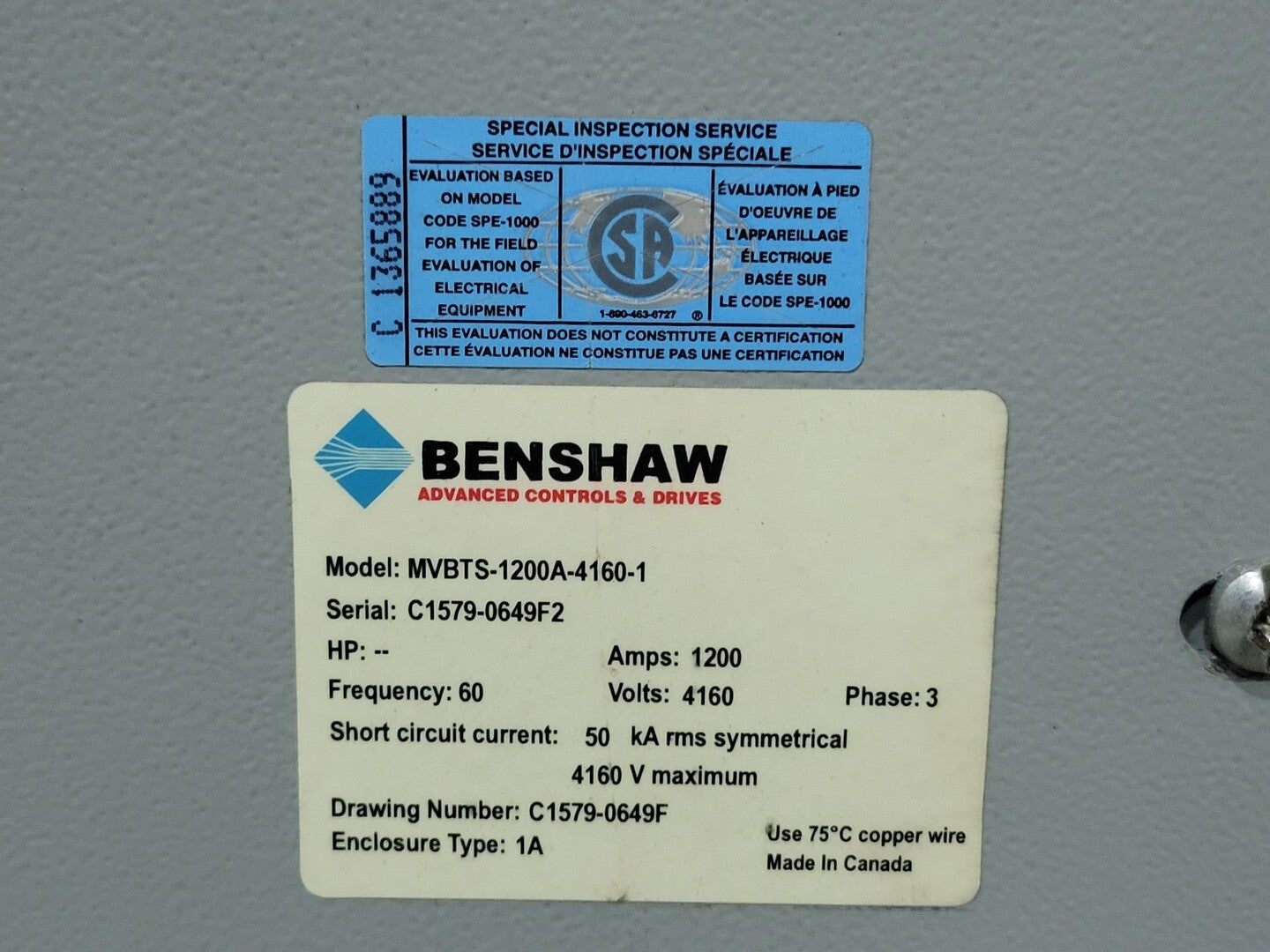 Benshaw #MVBTS-1200-4160-1, Switchgear Unit, 1200 Amps, 4160 V, 3 phase, 1A Type Encl Manufacturer: Benshaw Model: MVBTS-1200-4160-1 Amps: 1200 Stock # 118510 Price: $5,864 USD Request Info 10 For Sale by Lenmark Industries Surplus Record Dealer Since 2024 Contact Seller Langley, BC Canada Lenmark Sales 778-65...> Show Seller's Phone Number 778-653-5801 Let the seller know you found their listing on Surplus Record! View More Lenmark Industries ' ListingsDescription SKU: 118510Model: MVBTS-1200-4160-1Condition: UsedS/N: C1579-0649F2Electrical Specifications: Amps: 1200 amps Voltage: 4160 volts Phase: 3-phase Made In: CANADADimensions: 100.00 (H) x 31.00 (W) x 97.00 (L) inchesAdditional Description:Short Circuit Current: 50 kA rms symmetricalMax. Voltage: 4160 VEnclosure Type: 1A Request More Information from SellerInquire Further with Lenmark Industries! "*" indicates required fieldsName*Company*Email* PhoneZip / Postal Code*QuestionMake an OfferRequests Send me a shipping quote I am interested in financingSend Copy Email me a confirmation of this inquiryBuyer Protection Use our partner Escrow.com to buy or sell equipment safelyBuyer Protection Send me info about buyer protectionThis field is hidden when viewing the formDealer Email Buyers Who Viewed This Listing Also Viewed … General Electric #VB1-4.16-250-3, PowerVac switchgear unit, 1200 amp, 4160 VoltsCategory: Metal Clad SwitchgearSeller: Lenmark IndustriesLocation: Langley, BC Mfr: General ElectricModel: VB1-4.16-250-3SKU: 136622, Model: VB1 4.16-250-3, Condition: Used, Amps: 1200 amps, Voltage: 4160 volts, Phase: 3-phase, Dimensions: 105.00 (H) x 43.00 (W) x 100.00 (L) inches, Additional :, Generator Management Relay, Maker: GE, Model: 489, Thermostat, Maker: Rittal, Model: SK3110, Circuit Breaker, Maker: GE, Model: PowerVac VB1 ...moreFeatured Siemens #GM-SG, switchgear 15 kV 1200 amp with arc flash detectionCategory: Metal Clad SwitchgearSeller: IC SparesLocation: Los Angeles, CA Mfr: SiemensModel: GM-SGYear: 2018 Square D #5KV, outdoor metal clad swithgear, Type VR 1200 Amp Circuit Breakers Cat. No. V5D4133Y000Category: Metal Clad SwitchgearSeller: Atlas Electric IncLocation: Spokane Valley, WA Mfr: Square DModel: 5KV JAGG Electric, 5KV 1200 amp metal clad switchgear, 1 incoming, 5 outgoing feeders, new (2 available)Category: Metal Clad SwitchgearSeller: High To Low VoltageLocation: Commerce City, CO Mfr: Jagg Electric Eaton Arc resistant switchgear, 5 KV, 1200 Amps [ 4 Sections ] c/w transition cell to AB ARC RESISTANT MCCCategory: Metal Clad SwitchgearSeller: Surplus High Voltage AssetsLocation: Airdrie, AB Mfr: EatonShare × "*" indicates required fieldsYour Name*Your Email* Recipient's Email* Note to Recipient