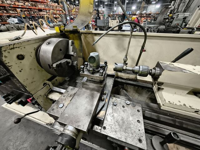 Accessories Observed: Steady rest, quick-change toolpost, coolant system, splash enclosure