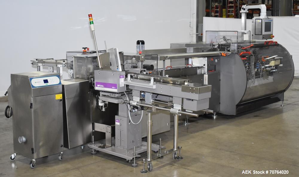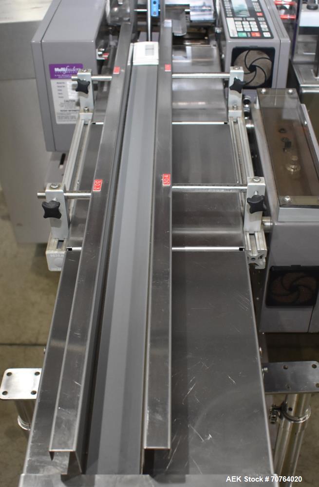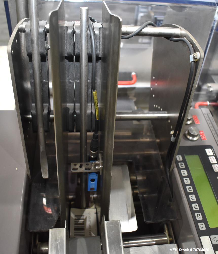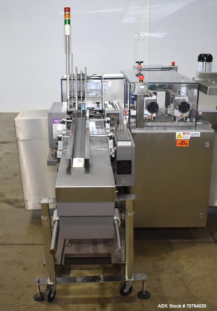 Bosch Model CUK 3060, continuous motion, stainless steel, horizontal tuck, cartoner rated from 40 to 220 cartons per minute – depending on materials and application. Carton size range: 60mm to 120mm in Length; 15mm to 85mm in Width; 75 mm to 120mm in Depth. a 72" long product infeed conveyor with guide ...more
