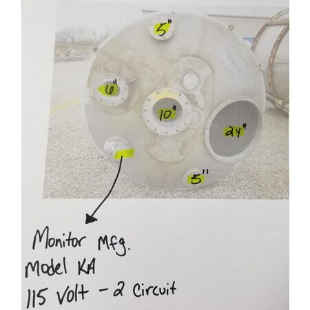 Used 196 cu ft Surge bin, carbon steel construction, approximately 66" diameter x 69" straight side x 92" deep cone bottom, flat top with 30", (2)2", (6)1.5" top nozzles, 30" side access door, 24" bottom outlet, top mounted Mikro Pulsaire dust collector, model 12, carbon steel construction, with 113 sq ft filter area ...more