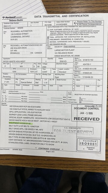 2 - Reliance Electric, 400HP, 2300 volts, 1200 RPM motors - belt driven design
