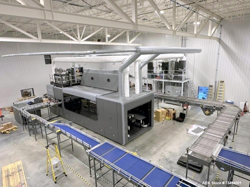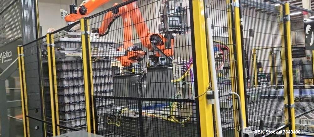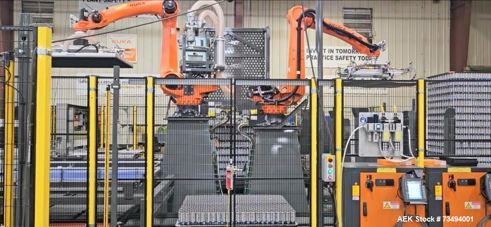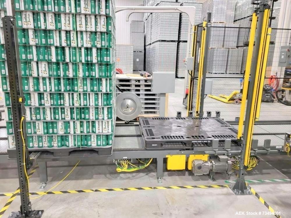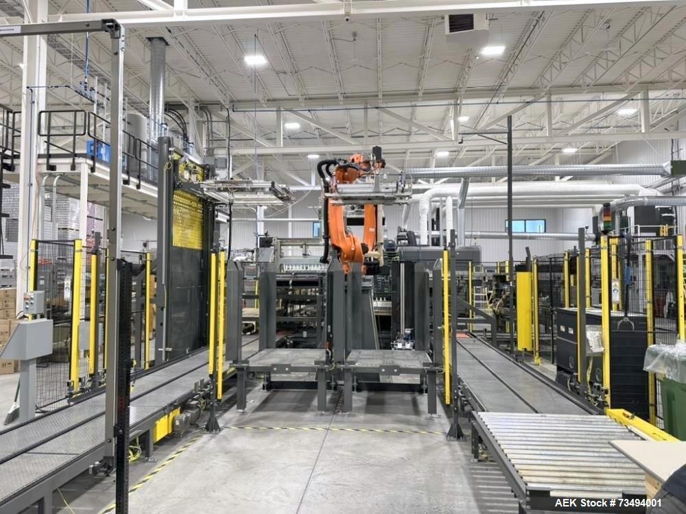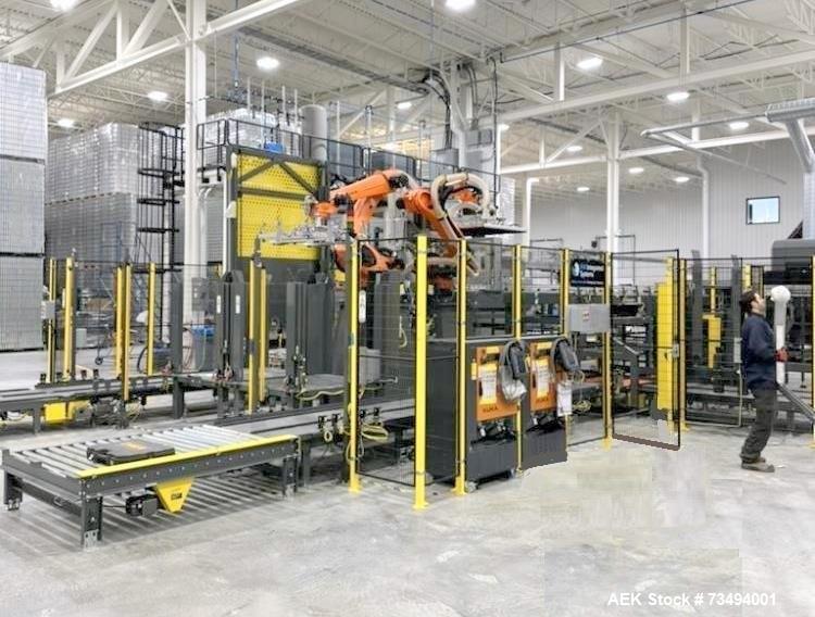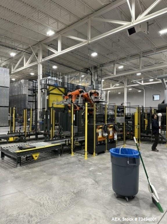 used bw integrated systems robotic can palletizer & depalletizer system | dual fanuc robots | 500 cpm | 2023. bwis two-robot automated cell handles every step of the depalletizing and repalletizing process; fanuc m410ic/315 robot with r30ib controller with fanuc r410ic/185 robot with r30ib controller for top frame and sheet handling; 500 cpm - size 202 and 204 cans, (also runs sleek 204, slim 200, and standard 211 can formats); top frames and tier sheets are automatically placed and removed; cans are loaded onto the mass conveyor and removed by layer for palletization; fully automated strapping system (signode mhb-tp12) eliminates manual pallet handling; buffer sections on infeed and outfeed prevent downtime and maximize efficiency. includes: change parts for 204 can diameter; 48" x 9-10" mechanical conveyor (robot discharge); printer discharge conveyor; isometric air conveyor; electrical controls panel, 3/60/480v; new in 2023. ready for installation! support available.