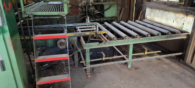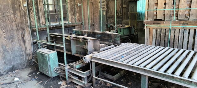 CAM-WOOD 1AM-1250 Double Head Pallet Notcher: -- Heavy-duty steel frame. -- (2) 10 HP Electric Motors. -- (2) On/Off switches with magnetic starters. -- Maximum notch size 9" L x 2-1/2" H x 1-5/8" D. -- Cutter-heads with (4) HSS knives installed. -- Saw dust removal: 12.25"; wide x 10.5"; tall each opening in the back ...more