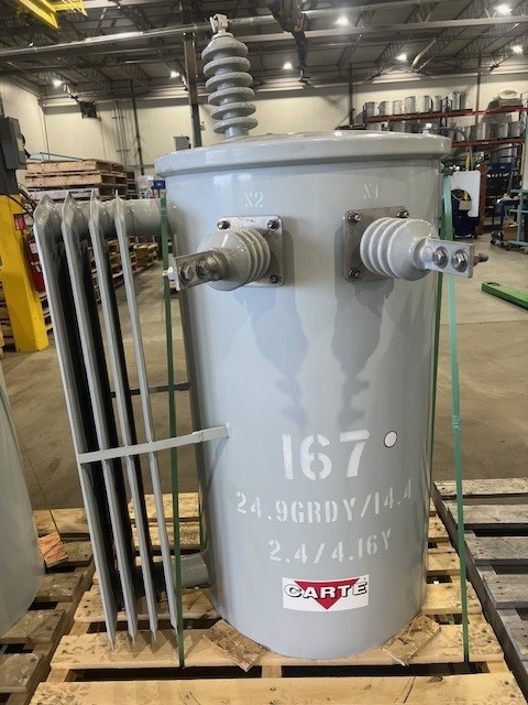 We have three (3) CARTE brand Single-Phase Pole-Mount Transformers (167 kVA) available for sale.