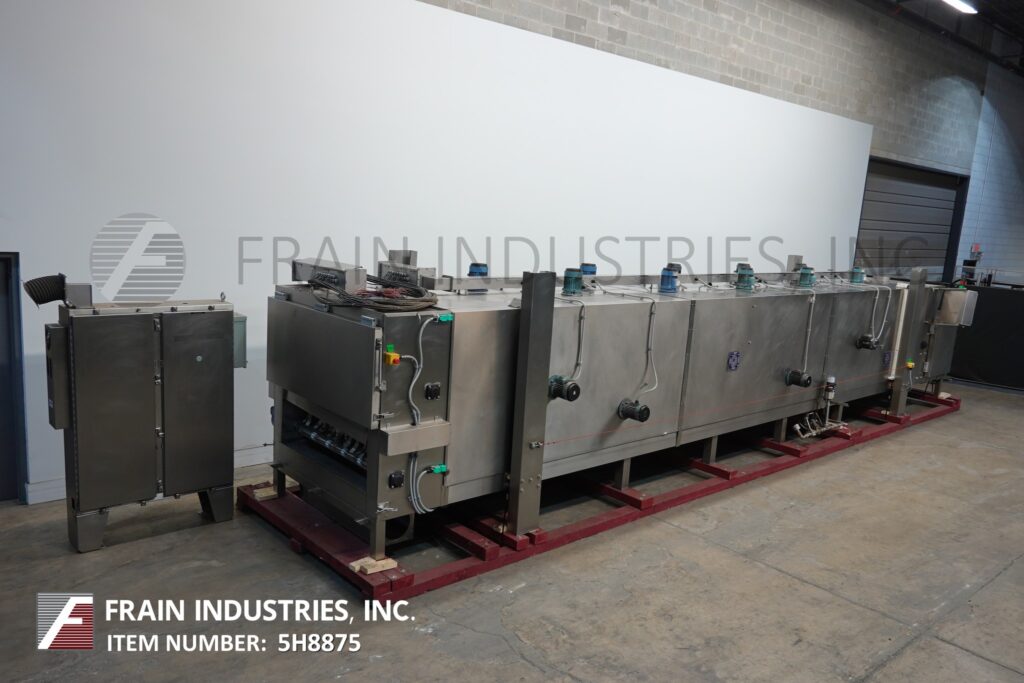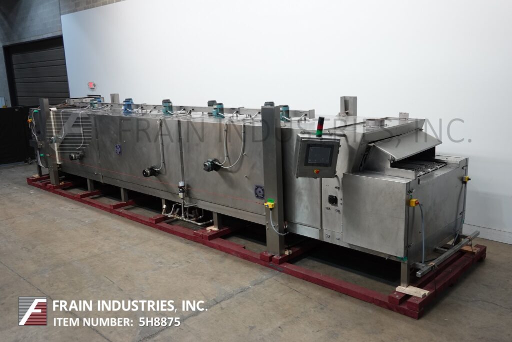 DSI Dantech Model CES-MP-LIN-30ft x 4ft-HOTL-PLC, 3-pass liquid nitrogen freeze tunnel with amount of product per hour – depending on materials, application and machine configuration. Stainless steel construction. Equipped with 48" wide stainless steel wire rod product conveyor belt, 55" high infeed, 32" high discharge, with 7" clearance between belt levels. (10) top mounted circulation fans and drives with top belt 33 feet long, middle belt 32 feet long and bottom belt 34 feet long. Remote control panel has A/B PLC with touch screen HMI. and A/B 525 Powerflex with statis light and e-stops. Mounted on heavy duty frame.