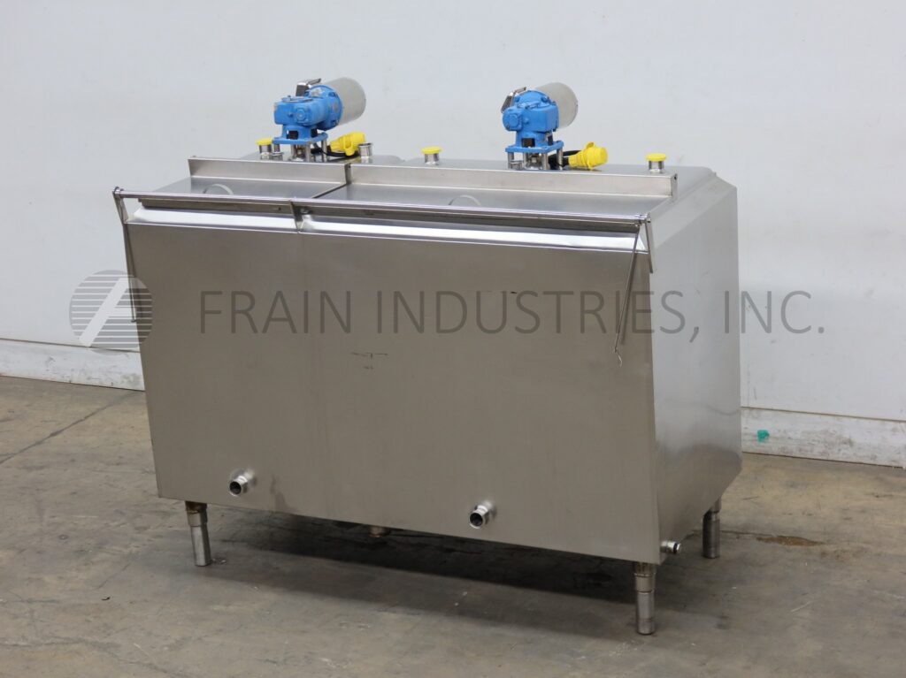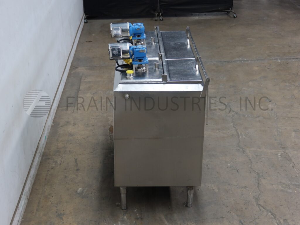 Cherry Burrell, model BC, 2-Compartment, 304 stainless steel, low pressure jacketed and insulated flavor tank. Left chamber is 100 gallons with inner dimension of 24" x 29" x 39" Deep. Right chamber is 200 gallons with inner dimension of 44" x 29" x 39" Deep. Equipped with lift up covers, top mounted prop agitation powered by ¾ Hp motor drive. Slant bottom has 2½" OD / 2" ID Tri-Clamp side bottom discharge with 13½" floor clearance.