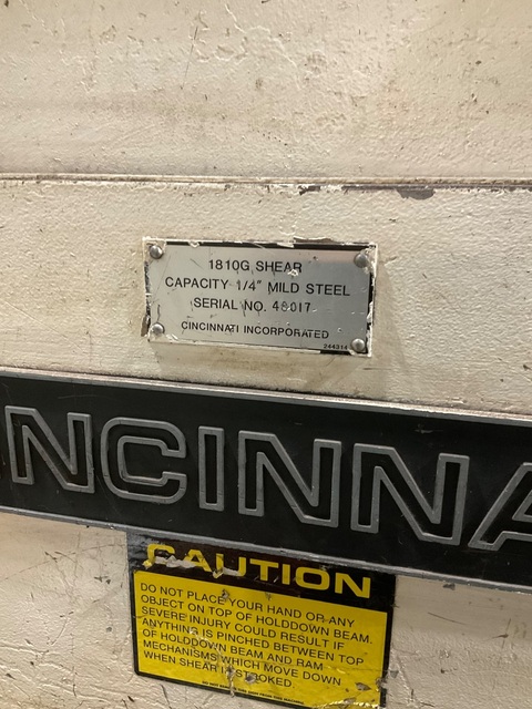 Description The CINCINNATI 1810G Power Squaring Shears is a used industrial-grade hydraulic shear designed for high-precision sheet metal cutting. Built by one of the most respected names in metal fabrication, this machine offers robust capacity and reliable performance for high-throughput operations. The 1810G model is engineered to handle a variety of metal thicknesses with clean, accurate cuts, making it an excellent choice for fabrication shops, service centers, and OEM environments requiring consistent sheet processing. Spec Sheet CINCINNATI 1810G SPECIFICATIONS: Dimensions... CONESTOGA Weight....... 999