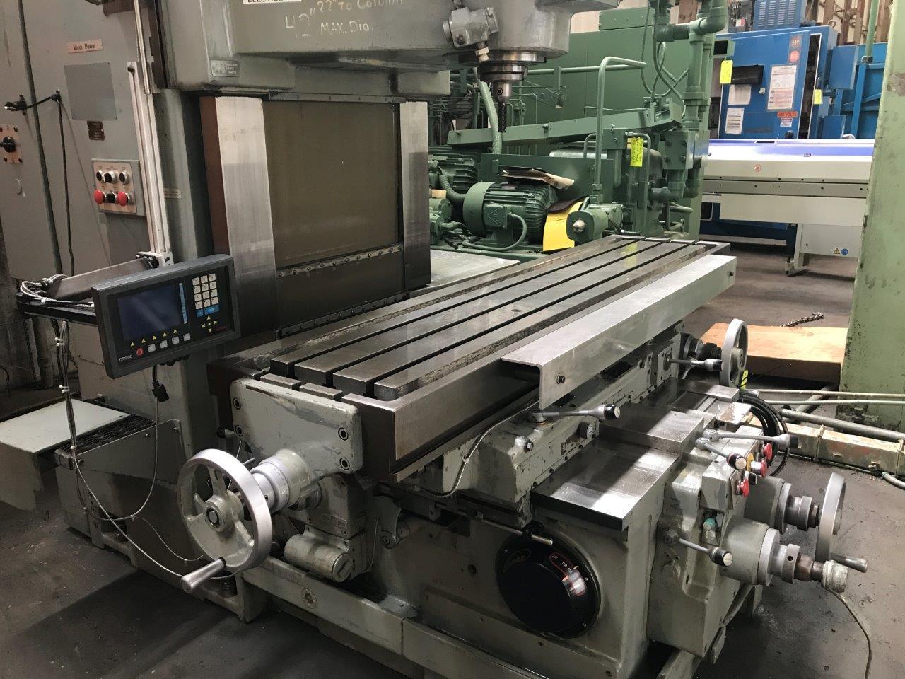 SERIAL. 819, MODEL. MDH-5V, WORKING SURFACE OF TABLE. 96" X 18"0 RPM, SPINDLE SPEEDS. (23) 18 TO 1800 RPM, LONGITUDINAL & CROSS FEEDS. 3/8 TO 84 IPM, VERTICAL FEEDS. (32) 1/8 TO 84 IPM, LONGITUDINAL TRAVEL. 51-1/8", CROSS TRAVEL. 15-3/4", VERTICAL TRAVEL OF KNEE. 15-3/4", VERTICAL HEAD TRAVEL. 5-7/8", SPINDLE NOSE ...more