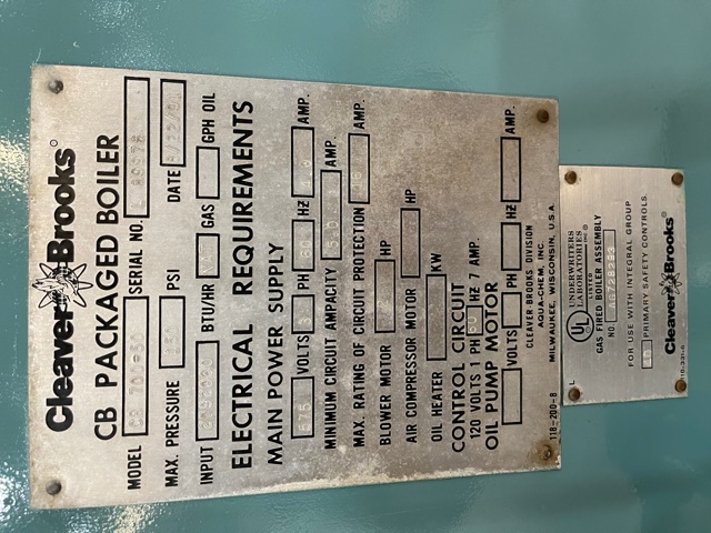 Used Cleaver Brooks Steam Boiler 1,725 steam lbs/hr, 2,792,000 BTU/hr, Model CB-700-50, 50 HP, MAWP 150 PSI, Fuel Natural Gas/Oil, Boiler Weight 7,000 lbs, Built 1991