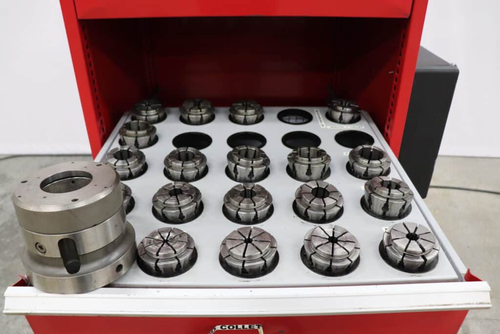 - (19) Round Collets: (1/4-3/8) , (3/8-1/2) , (1/2-5/8) , (5/8-3/4) , (3/4-7/8) , (7/8-1) , (1 – 1.1/8) , (1.1/8-1.1/4) , (1.1/4-1.3/8) , (1.3/8-1.1/2) , (1.1/2-1.5/8) , (1.5/8-1.3/4) , (1.3/4-1.7/8) , (1.7/8-2) , (2-2.1/8) plus four additional special collets