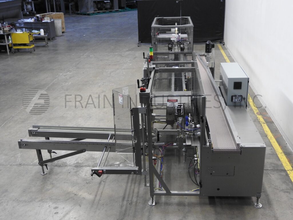 Combi America, Model Ergopack HS. Rated from 5 to 20 cases per minute – depending on materials, application and operator dexterity. Case size range: 8" to 24" in Length; 6" to 16" in Width; 5" to 18" in Height. Equipped with 72" long blank case magazine, suction cup reciprocating pick and place, minor and major flap closers, mechanical pusher bar, 2" tape head, 12" wide x 192" long product conveyor and 80" long packing station running parallel to 12" wide x 92" long case conveyor. Top case taper equipped with minor flap closer, major flap plows, 3" wide dual side gripper belts, 2" top / bottom tape heads, hand crank adjustable with Siko gages and interlocking Lexan safety guarding. Control panel with tough screen HMI. Mounted on heavy duty frame.