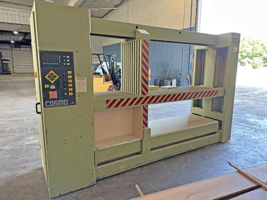 COMIL - COSMO/2: Case Clamp (Semi-Automatic) -- SpecificationsWorking height: 11.8" - 51" (300 - 1,300 mm); Working length: 11.8" - 96" (300 - 2,438 mm); working depth: 5-1/2" - 30" (140 - 762 mm); 20" (500 mm) working height off floor.Motorized horizontal & vertical beams move simultaneously or individually at 13 FPM (4 MPM). -- ClampingVertical & horizontal interlocking pressure walls; each with: (8) Individual beams; move parallel & square to the Clamp frame's sidewall.Operator Control Panel: Built into left side of clamp. -- FeaturesManual switch setting for input of cabinet sizes; switches for 3-level pressure setting (70% - 85% & 100%); cycle timer; function button; control lights. The Control Panel allows the programming of the pressing time. Max. pressure: 3,300 Lbs per pressure beam; adjustable pressure sensor stops beam at a preset pressure; timer opens Clamp automatically. -- Actual Model is COMIL - COSMO/2.