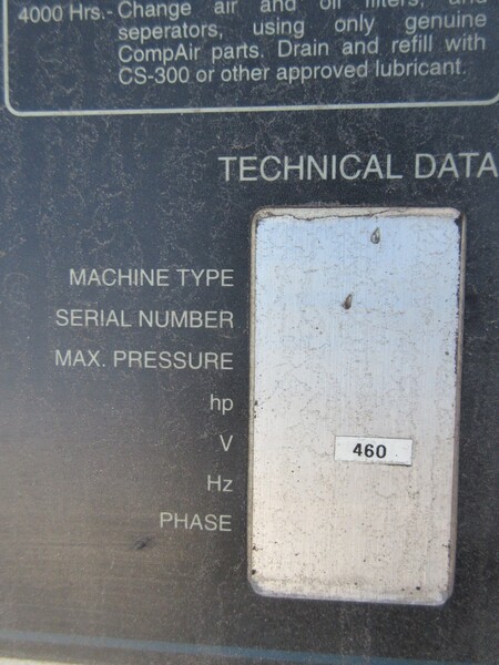 258 CFM, 125 PSI MAX PRESSURE, 3898 HOURS, 460 V, 80" LR X 46" FB X 56" T, 2500 LBS APROX. WEIGHT.