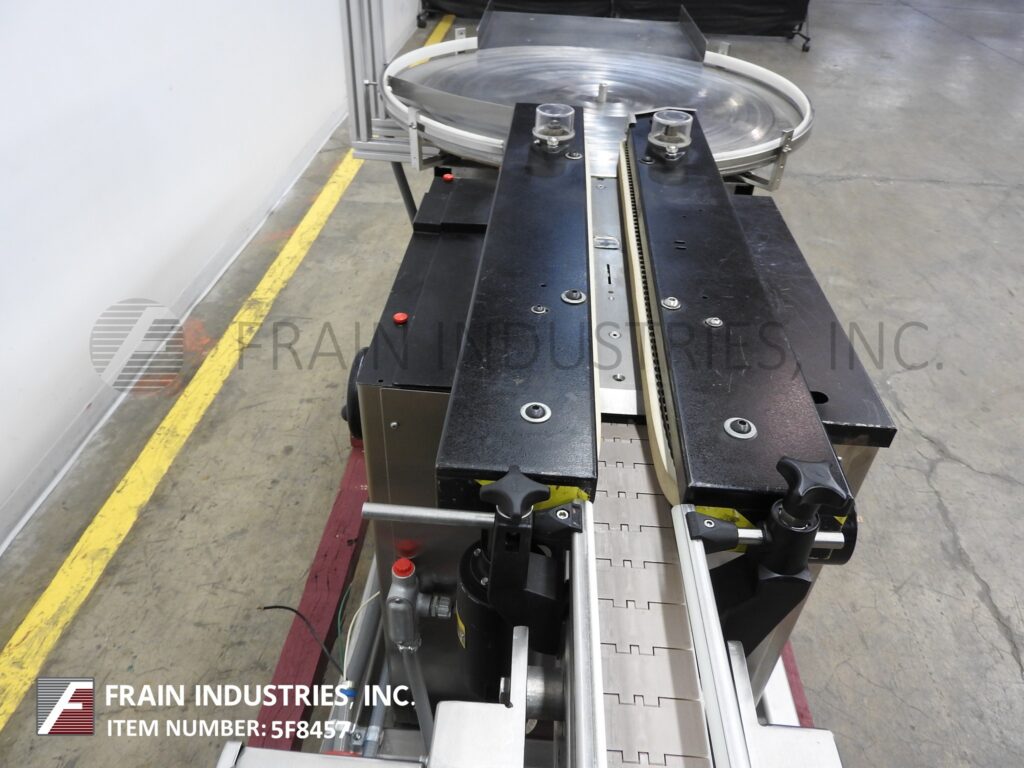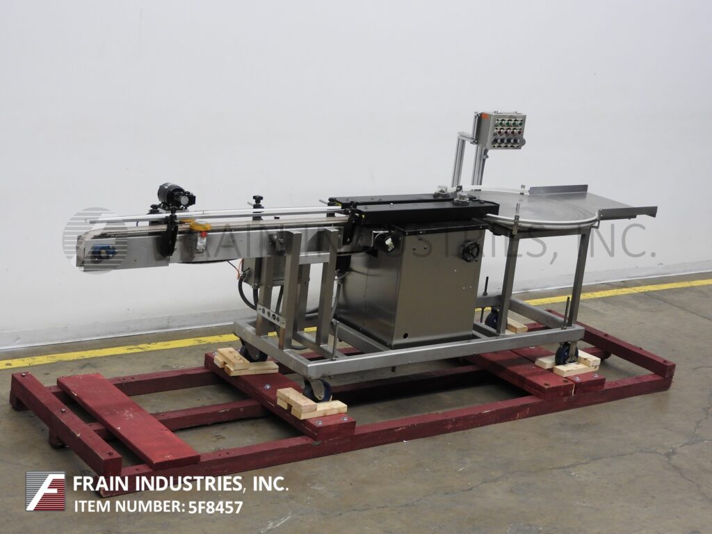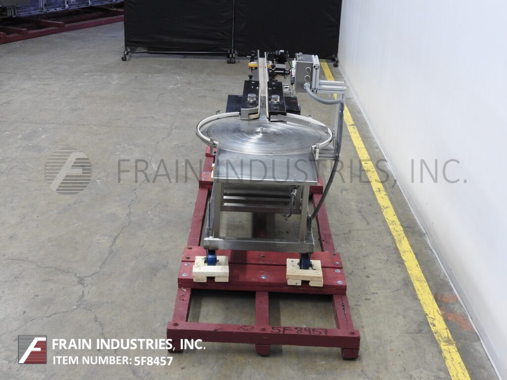Control Print Model 400Tran, Inline side belt transport system rated from 50 to 250 containers per minute – depending on materials and application Container size range: 1" to 7" in Length; 1" to 7" in Width; 1" to 12" in Height. Equipped with 36" in diameter disc unscrambler with 20" long x 22-3/4" wide product unload platform, 36" long container side transport conveyor with dual 36" long x 1" wide side conveyor belts, to a 36" long x 2-1/2" wide conveyor section with spacing wheels. Control panel has turntable, transport, conveyor and space wheel on / off buttons with speed control dials and e-stopand mounted on stainless steel base frame with casters and screw legs