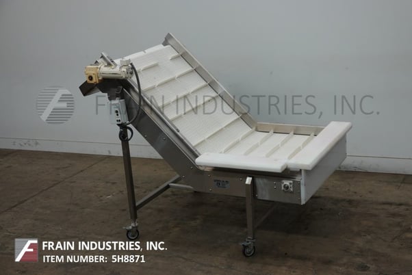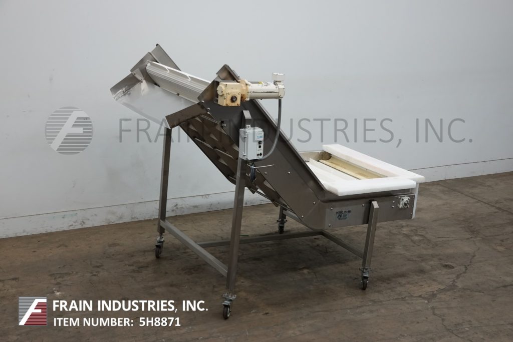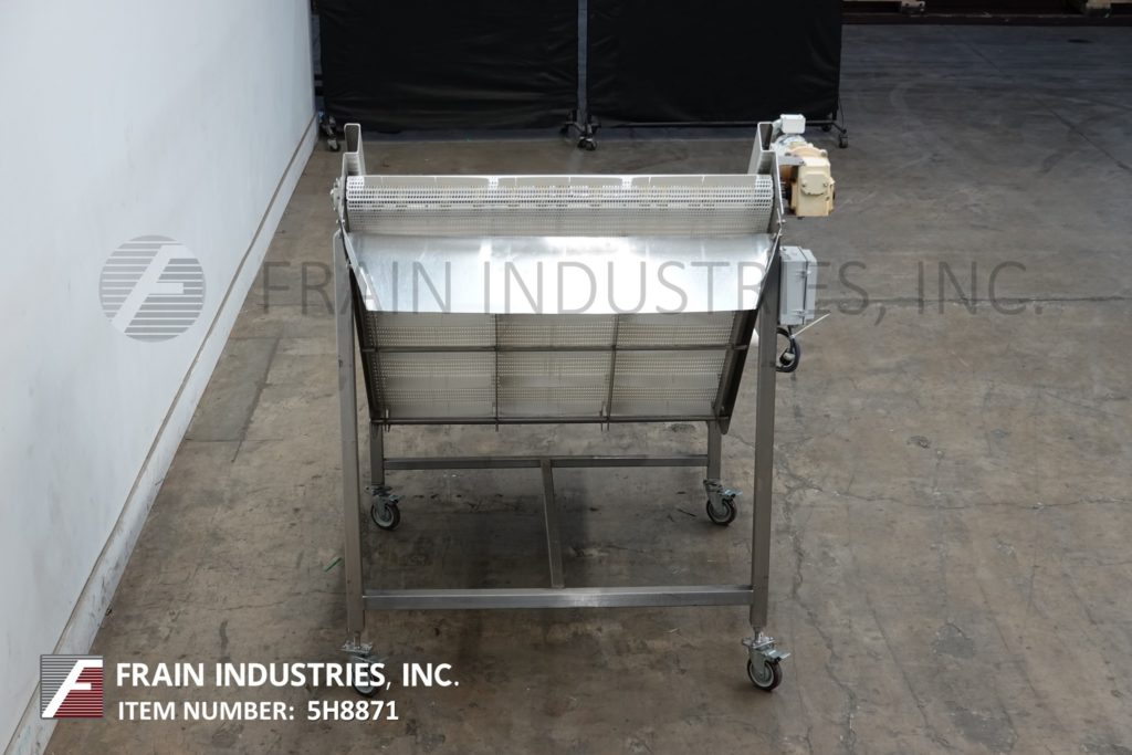 Stainless steel inclined cleated conveyor with amount of product per hour – depending on materials and application. Equipped with 48" wide x 88" long Intralox belt with 2" high cleats set on 9" centers. 23" in feed height and 42" wide discharge chute with 47" ground clearance. Top mounted ½ Hp motor drive with variable speed controller. Mounted on stainless steel frame with casters.