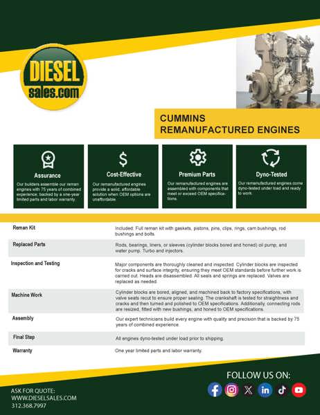 Premium Remanufactured Cummins Qsk19 Complete Diesel Engine. Starting At $79,995.00 Sold Exchange With One Year Or 2,000 Hrs. Whichever Occurs First, Limited Parts & Labor Warranty. Plus $15,000 Refundable Core Deposit, Dr1627rx. Add Abs#12139 Warranty