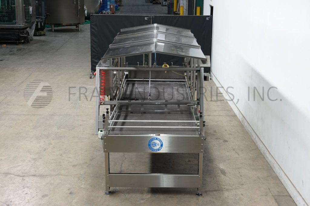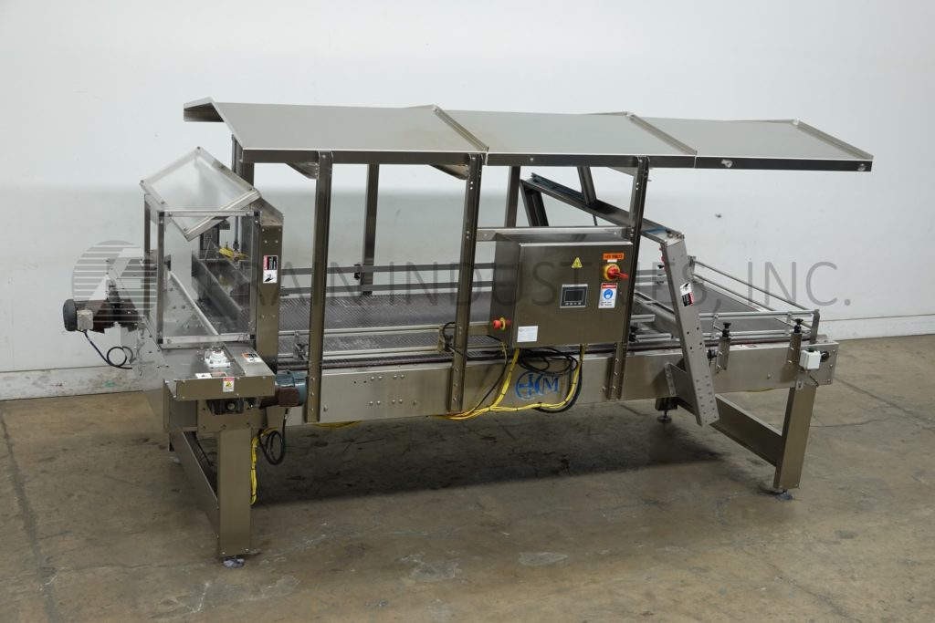 Custom Metal Designs Inc, Model SDA-1000-RR, semi-automatic debagging conveyor. Equipped with a 48" wide x 138" long conveyor with a 48" wide x 35" long loading area, foot pedal operated pneumatic bag cutter and 3½" wide x 64" long lugged 90° transfer conveyor. Control panel with AB controller and touch screen HMI.