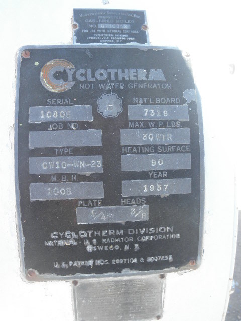 | Description: | Used Gas fired hot water generator, maximun working pressure 30WTR, plate 1/4, heads 3/8, heating surface 90, with a Jefferson electronics ignition transformer serial# 638283, national board number 7318 |