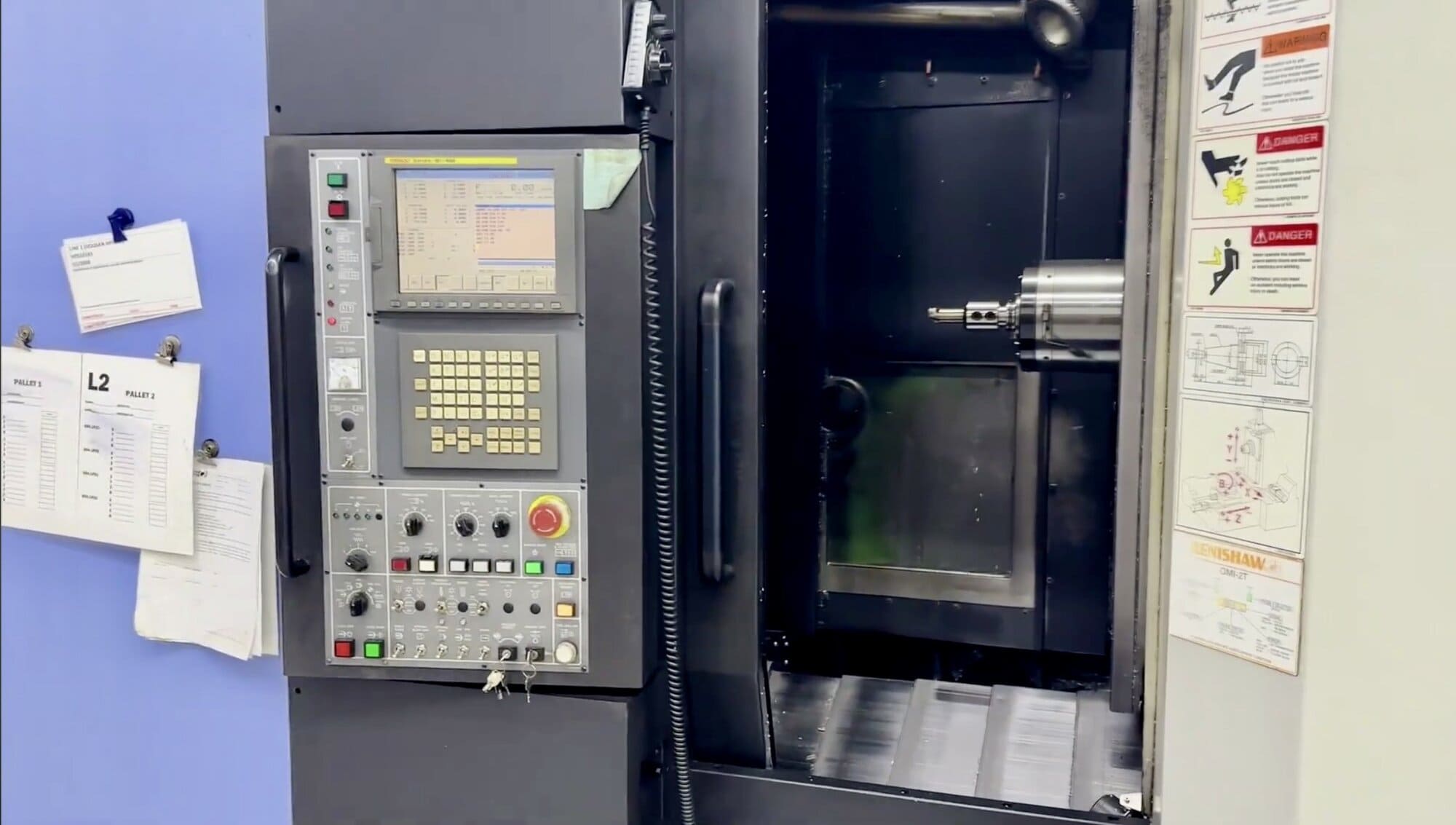 , X-Axis: 31", Y-Axis: 27", Z-Axis: 29", Power: 30 HP, Spindle Speeds: 10,000 RPM, Number of ATC: 90, Pallet Width: 20", Pallet Length: 20", Spindle Taper: CAT 50, Machine Dimensions: 197" x 130" x 126", Machine Weight: 38,350#.