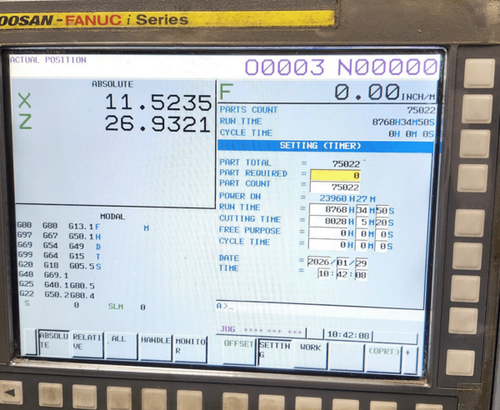 General Info Stock #: 113260004 Brand: Doosan Model: Puma GT 3100 Year: 2016 Condition: Excellent (Used, Original Owner) Hours: Approx. 8,000 Cutting Hours (as of January 2026) Approx. Shipping Weight: Not Specified (Typical ~12,000-15,000 LBS for similar models) Specifications Max Swing: 28.3" (718.82 mm) Max Cutting Diameter: 18.9" (480.06 mm) Max Cutting Length: 29.7" (754.38 mm) X-Axis Travel: 10.2" (259.08 mm) Z-Axis Travel: 32.7" (830.58 mm) Chuck Size: 12" (304.8 mm) Bar Capacity: 4" (101.6 mm) Spindle Bore: 4.53" (115.06 mm) Spindle Nose: A2-11 Spindle Motor: 45 HP (33.6 kW) Spindle Speed: 2,800 RPM Turret Positions: 12 Equipped With DOOSAN-FANUC i Series CNC Control, 2-Speed Gearbox, 12" 3-Jaw Hydraulic Chuck, S26 Collet Chuck, Programmable Tailstock, Tool Presetter, Chip Conveyor, Box Ways Additional Info Original owner 2016 Doosan Puma GT 3100 2-axis CNC lathe in excellent condition, primarily used for cutting stainless steel & aluminum. In plant, under power, and ready for immediate inspection, demo, or purchase. As-is, where-is. Contact us for additional photos, video (if available), or to schedule a viewing. Sourced from trusted partner dealer. Also available in the same plant: 2017 Doosan Lynx 2100LB.