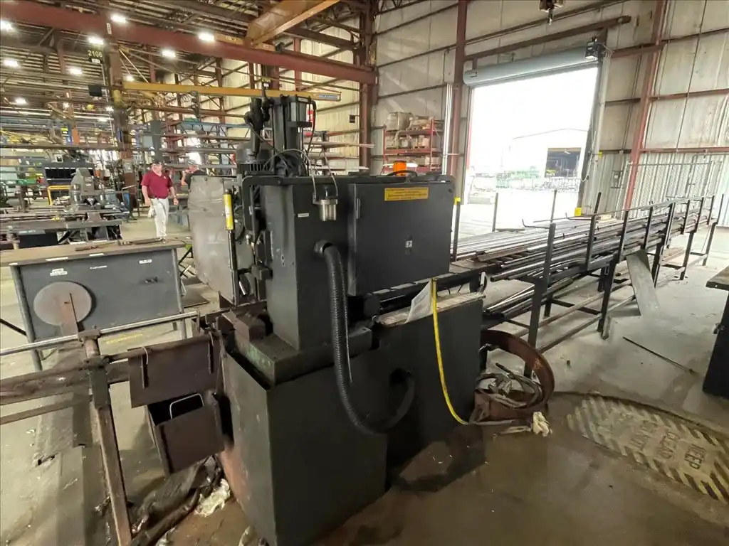 MODEL #: VMS111-8350, SERIAL #: NM0041403, MITRE BASE, MANUAL HEAD FEED, MANUAL CLAMPING, COOLANT PUMP, 9" W x 10' L IN FEED AND OUT FEED GRAVITY ROLLER CONVEYORS, 2-1/2 HP WORK HEAD MOTOR, GOOD CONDITION.