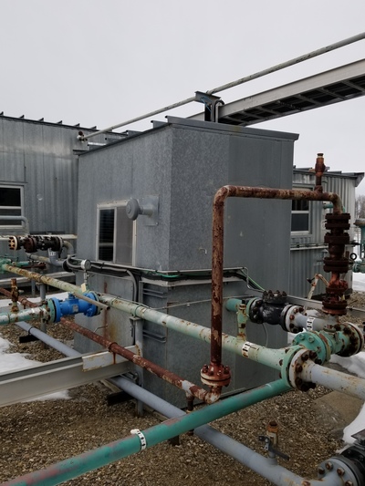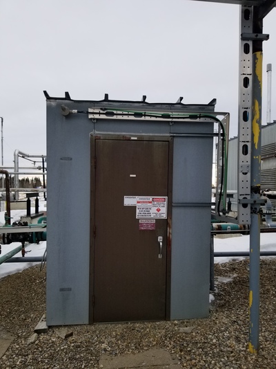 Inspection report for a building located in Sylvan Lake, AB, Canada. The checker plated floor is missing and the building is currently supported by wooden planks. The structure measures 6 ft in width, 5 ft in length, and stands at a height of 8 ft. Built in the year 2000, this operational unit is heated and has a connected meter run configuration with a diameter of 4 inches.