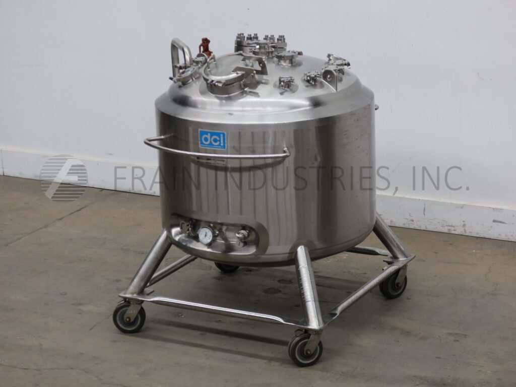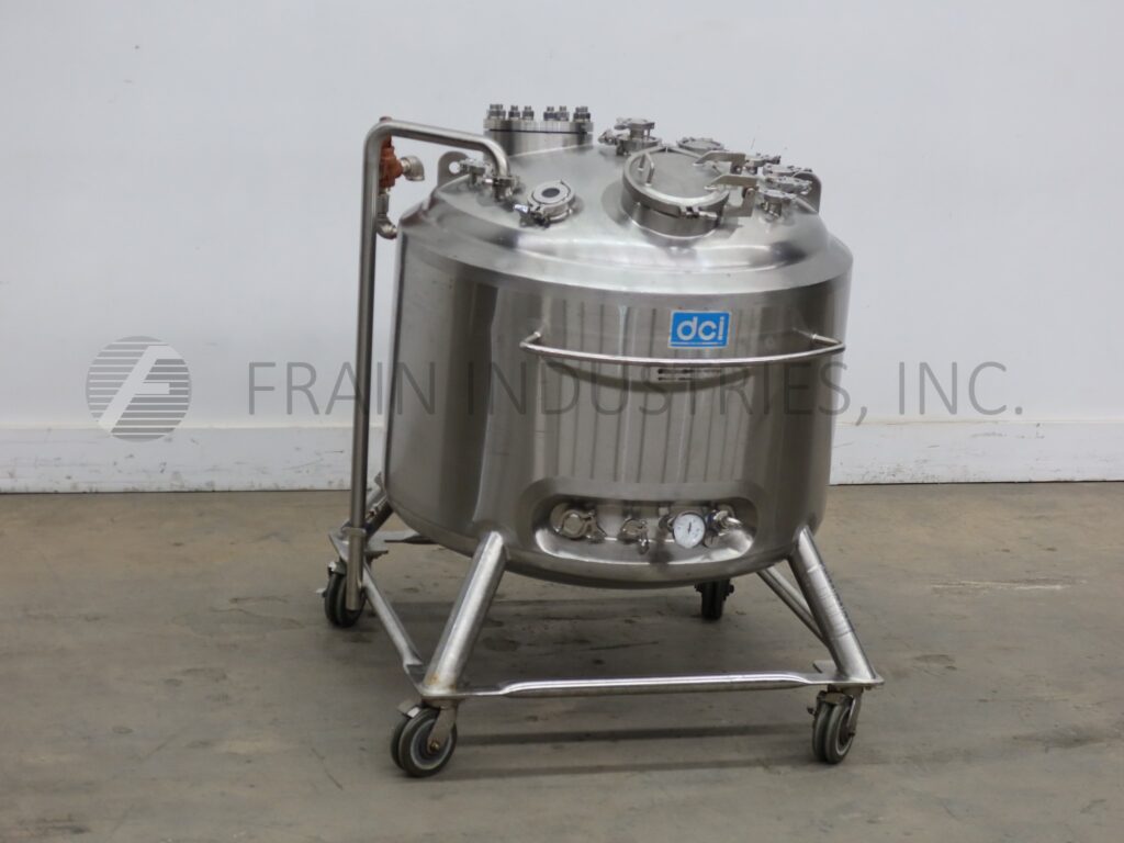 DCI, 105 gallon capacity, 316L stainless steel, insulated and jacketed tank. Vessel Dimensions: 36" diameter with a 24" side wall. Equipped with 8" Tri-Clamp manway, (1) CIP spray ball supplied by (1) 1½" Tri-Clamp, thermowell and 1½" Tri-Clamp discharge with 10" ground clearance. Mounted on (4) stainless steel tubular legs with castors.