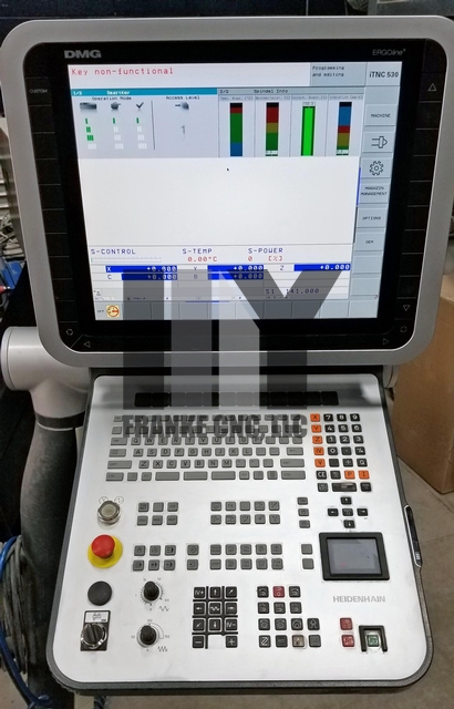 5-AXIS MACHINING CENTERS DECKEL MAHO DMU 40 monoBLOCK SUBJECT TO AVAILABILITY, AND TERMS AND CONDITIONS FOLLOWING, WE OFFER FOR YOUR CONSIDERATION: Used 2010 DECKEL MAHO DMG-DMU 40monoBLOCK Full 5-Axis Machining Center: -HISTORY- Used 825 hours in an artist's studio to mill aluminum & copper sculptures Made in Pfronten, Germany, this is a Full 5-Axis Simultaneous machine Heidenhain iTNC530 CNC control with 15" TFT screen & Electronic Handwheel -WORKING RANGE- -FEED DRIVES- -TOOL MAGAZINE- -HEIDENHAIN GLASS SCALES X/Y/Z AXES DIRECT PATH MEASURING SYSTEM- -HEIDENHAIN ROTARY ENCODERS B/C AXES DIRECT PATH MEASURING SYSTEM- -EQUIPPED WITH- Fully enclosed protection cabin NC Rotary Table (C-axis) full 4th axis 18,000 RPM Motor Spindle with Active Cooling NC-Controlled Swivel Milling Head (B-Axis) 5th Axis with Active Cooling Swivel Range 125 Degrees(0 is Vertical/-90 is Horizontal) +30/-95 Degrees Rapid traverse of the B-Axis is 35 rpm, swivelling time approx. 1.5 sec 158 gallon (600 liter) high pressure coolant tank with paper band filter 580 PSI (40 bar) coolant thru the spindle centre Chip conveyor External flood coolant on outside of spindle 14.5 PSI (1 bar) pressure, 10.6 gallon/min (40 l/min) flow rate Infrared parts measuring touch probe BLUM Laser tool measuring-tool length & diameter & broken tool detection NFS-Server software Cooling by air blast Spray pistol with pump Signal lamp with 4 colors 3D quickSET machine kinematics calibration kit