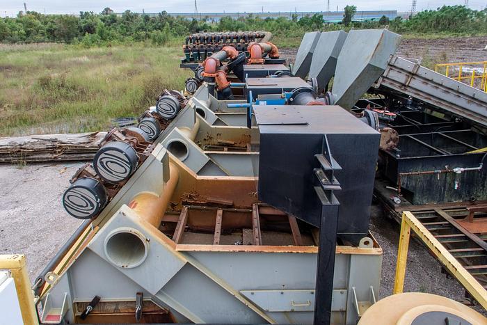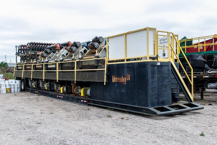 3,000 gpm, 72 tph (20% solids) single Unit, 25 micron, Desander-Desilter Dredgewater Processing (UFR, Ultra Fines Recovery). Unit features: ‣ 1 ea. - Tank Skid w/ 12,000 gal. Capacity; ‣ 6 ea. - 8X6X14 60 HP Centrifugal Pumps for Desanders, Desilters and Clean Tank Transfer; ‣ 1 ea. - 4X3X13 30 HP Centrifugal Pump for Mud Guns and Trough High-Pressure Sprayers; ‣ 2 ea. - 20 Cone 4" Desilter Assemblies w/ 2" Isolation Valves; ‣ 2 ea. - 3 Cone 12" Desander Assemblies; ‣ 6 ea. Hyper-G 6 Panel, Double Deck Shakers w/ Single Point Jack; ‣ 10 ea. - High Pressure Mud Guns, 2' X 5/8 Bore; ‣ 1 ea. - Mud Agitator w/ 5 HP Motor; ‣ 1 ea. - Smart Electrical Control Panel, Wireless Control and Automation; Level Sensors, Pressure Sensors and Wi-Fi Access; ‣ 1 ea. - 56 ft. Rock Over Trailer w/ Hydraulic Lift System, 90K Single Point Dual Axle Suspension; ‣ OSHA Compliant Handrails, Catwalk and Grating; ‣ 1 ea. - Foldable Ladder and Catwalks;
