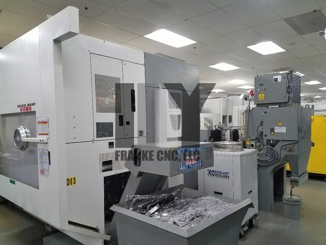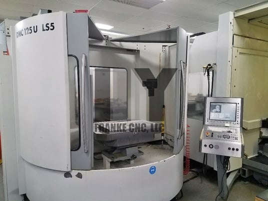 5-AXIS MACHINING CENTERS DECKEL MAHO DMC125U LS5 hi-dyn SUBJECT TO AVAILABILITY, AND TERMS AND CONDITIONS FOLLOWING, WE OFFER FOR YOUR CONSIDERATION: Used 2002 DECKEL MAHO DMC125U LS5 hi-dyn 5-AXIS UNIVERSAL MACHINING CENTER: >>>>Inspect machine in plant under power by appointment !<<<< >>Price includes professional de-installation and shipping preparation<< >>Price includes loading onto your flatbed open top trucks<< >For extra fee same engineers will re-assemble & re-install on your floor!< Machine was made in Pfronten, Germany This machine is capable of simultaneous 5-axis and 5-sided machining because of the universal swivel head which moves continuously between vertical and horizontal spindle positions. HEIDENHAIN MillPlus iT CNC Control with electronic handwheel -WORKING RANGE- -MAXIMUM WORKPIECE CONTOUR AND HEIGHT FROM TABLE SURFACE- -WORKING TABLE (7 PALLETS) NC ROTARY TABLE- **Has clamping hydraulics for working table** -5TH AXIS MILLING SPINDLE- NC Controlled B axis milling head. 4 seconds swivel time Horiz.-Vertical Head swivels from horizontal to vertical & vertical to horizontal position In addition head has a NC Controlled swivel range from vertical position 0 degrees to the left -7 degrees (in direction of tool magazine) and to the right to horizontal position +180 degrees=3D187 degrees total swivel range -MAIN SPINDLE DRIVE- -FEED DRIVES- -180 POSITION TOOL CHANGER- -COOLANT PUMP- -COOLANT THRU THE SPINDLE; WITH COOLANT TEMPERING- -WEIGHT- Load on machine base including 2 x workpiece weight 35,494 lbs (16,100 kg) -EQUIPPED WITH- Automatic pallet changer with 7 pallets total BLUM Laser tool length measuring and broken tool detection RENISHAW infrared parts measuring probe Clamping hydraulics for working table Coolant tempering(Coolant is chilled & temp controlled for high accuracy) SMOG HOG Oil and Emulsion mist separator Optional high output chiller Spray pistol with pump Available books, manuals, documentation Price quoted is in United States Dollars