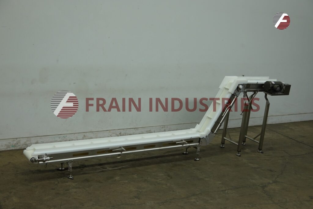 Nercon, Z-Style, stainless steel, inclined cleated conveyor with number of product per hour – depending on materials and application. 10" wide white neopreme belt and side guards with 4" high cleats set on 20" centers. 45" long horizontal floor run has 30" in feed height. 76" long ...more