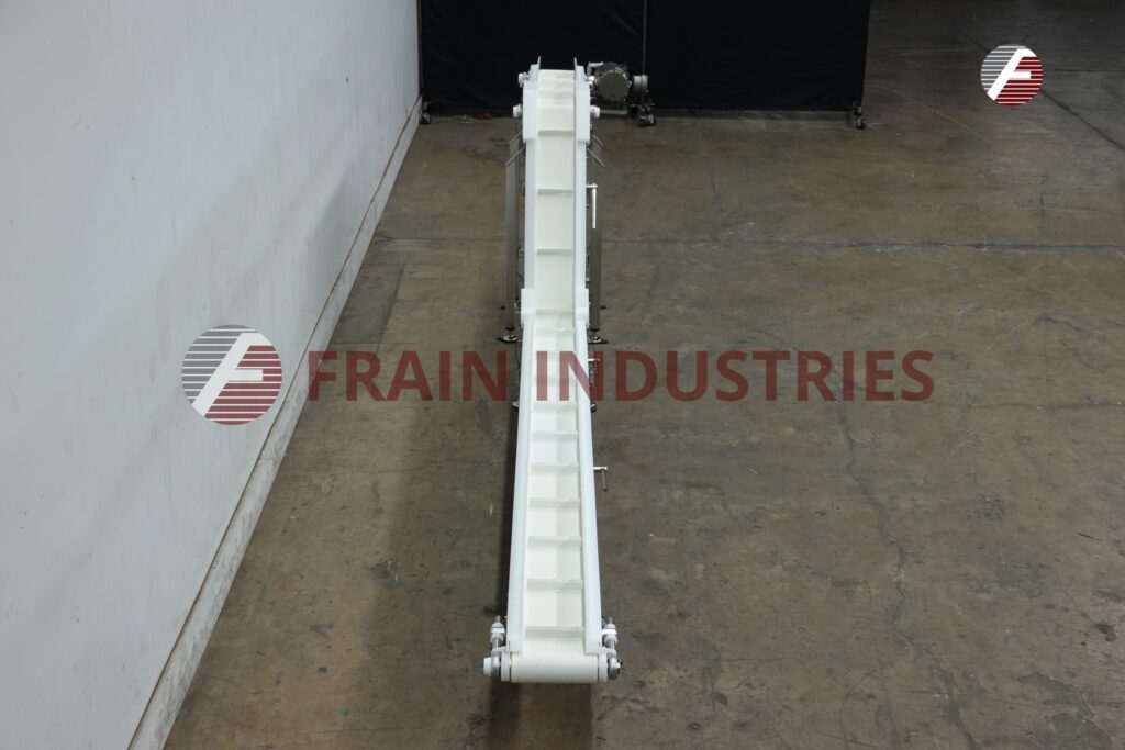 Stainless steel inclined cleated feed conveyor with pounds of product per hour – depending on materials and application. 10" Wide x 107" Long, Neoprene belt, 42" bottom horizontal run, 65" Long incline, 25" high infeed with 3" high cleats set on 6¼" centers and a ...more