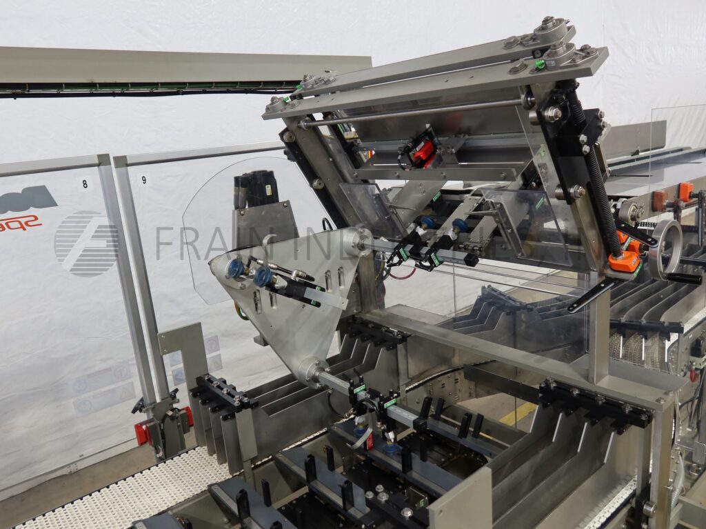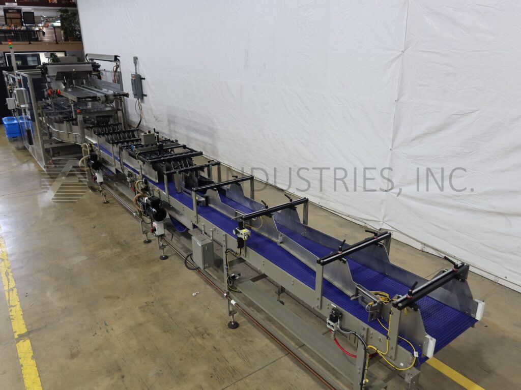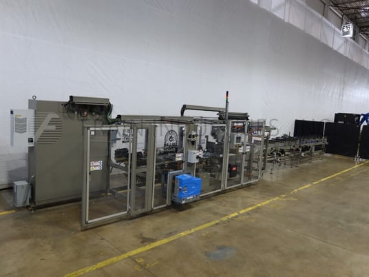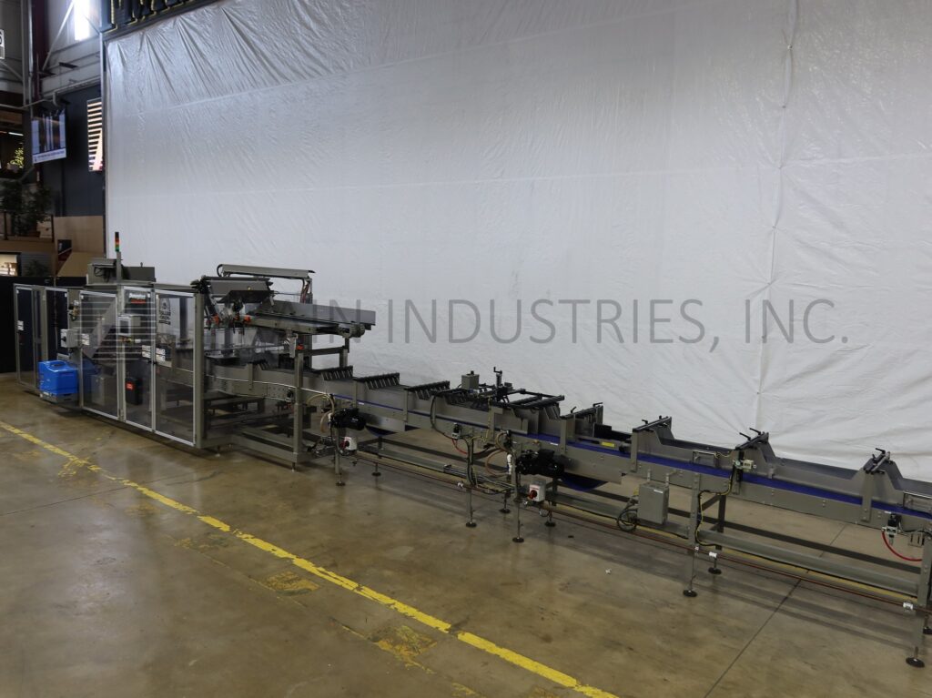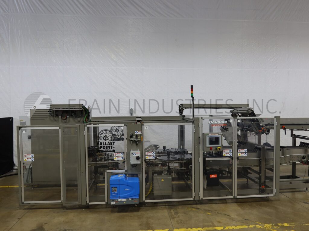 Douglas, Model SPECTRUM, Automatic, continuous motion, horizontal, multipack, hot melt glue cartoner. Rated up to 2,400 cans or 1,400 bottles, 4 to 24 single tier packs and 250 cartons per minute – depending on materials, application. Product and carton size range: Per application. Equipped with product in feed conveyors with (6) lane dividers that split into dual (3) lane dividers to star wheel indexing, 72" long powered blank carton magazine and (3) head rotary pick and place, with (4) chains adjustable set on 9" centers, and 1½" wide x 2" high lugs, with dual tucker / seating wheels product loaders one each side, Nordson ProBlue hot melt glue system, with plow type major and minor flap closers, cycle stop for unsealed cartons, timing belt drive compression section and discharge conveyor. Control panel has A/B controller and A/B touch screen HMI controls with A/B powerflex vari-speed controllers, e-stop buttons and statis light bar. Mounted on heavy duty tubular steel powder coated cold rolled steel frame with interlock safety door guarding.