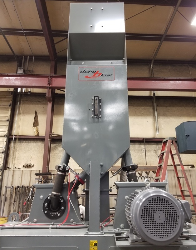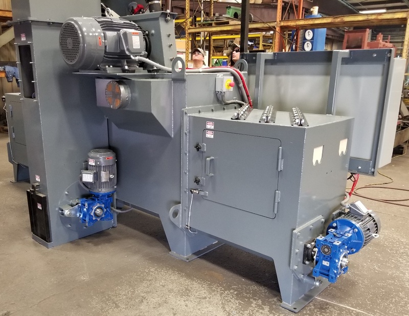 DE, Wye type spinner ahngerf blast cleaning machine, 48" x66" opening, (2) 10 HP wheels