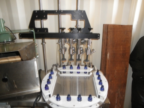 E-Pak 4-head bottle filler, filler is semi-automatic and is setup with (4) 3/8" diameter nozzles, stainless steel, inline fill nozzles with rotary turntable that includes (4) slots on each turn to hold bottles. Set up for small bottles. Previously used at personal care processing facility. Nozzles are controlled by foot pedal and turntable is manual. Set up for defoaming and includes small stainless steel diaphragm pump. Change parts - includes 1/4" diameter fill nozzles and bottle carriers with openings of 2/3", 1-1/4", 1-1/2" & 2" diameter. Unitized on skid. Serial# 113-31209-208-001.