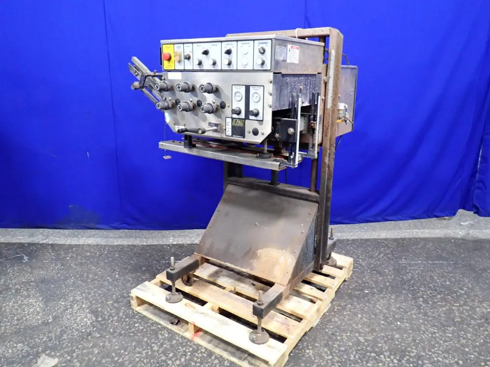 Eastern Machine bottle capper with vibratory feeder model CB104. Unit has nominal capacity of 180 caps/min, max cap size of 60mm. Unit run by 1/2 hp, 90 volt. Hopper dims of 29" long x 25" wide x 9" tall with 21" dia feeder, 115v. Bottle grip lane is 31" long x 2-1/2" wide, adjustable. Last used on cap sizes 23, 28 ...more