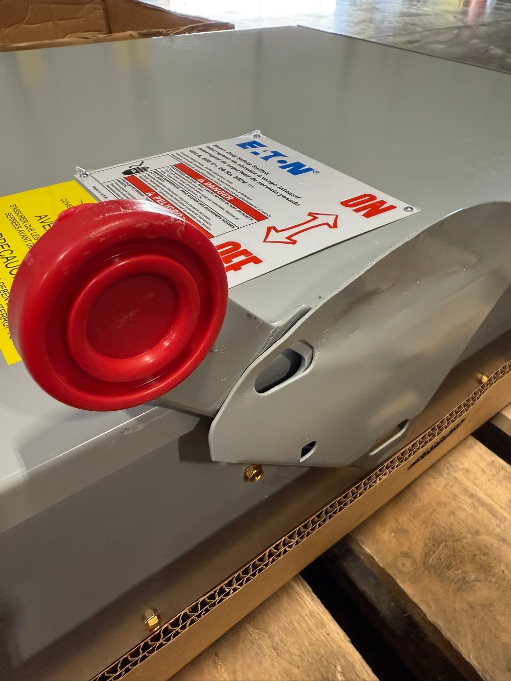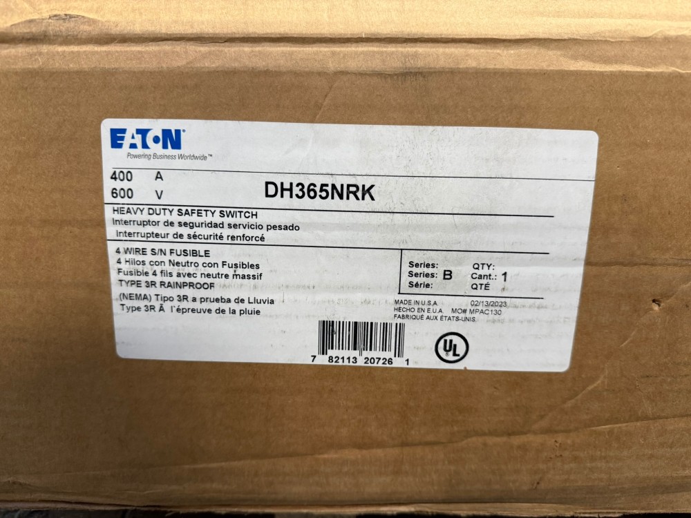 400 Amp. Eaton DH365NRK, 45" Heavy Duty Fusible Safety Switch 600 Volts NEMA 3R Rainproof Manufacturer: Eaton Amps: 400 Price: $4,000 USD Request Info 9 For Sale by QSGI Inc Surplus Record Dealer Since 2025 Contact Seller West Palm Beach, FL Marc Sherman 561-37...> Show Seller's Phone Number 561-371-7540 Let the seller know you found their listing on Surplus Record! View More QSGI Inc 's ListingsDescription Condition: New, Open Box. Please note, the on/off switch handle was damaged during shipping and slightly scrapes against the side of the guard (see pictures).Unit Dimensions: 27" Width, 9" Depth, 56" HeightShipping: Free local pick up or set up your own truck.Contact us for a shipping quote, provide zip code.Shipping Weight: 183 lbsShipping Dimensions: 60" x 48" x 18" Request More Information from SellerInquire Further with QSGI Inc! "*" indicates required fieldsName*Company*Email* PhoneZip / Postal Code*QuestionMake an OfferRequests Send me a shipping quote I am interested in financingSend Copy Email me a confirmation of this inquiryBuyer Protection Use our partner Escrow.com to buy or sell equipment safelyBuyer Protection Send me info about buyer protectionThis field is hidden when viewing the formDealer Email Buyers Who Viewed This Listing Also Viewed …JUST ADDED! 400 Amp. Square D #H325N, Safety Switch, 240 VAC, 3PHCategory: Safety SwitchesSeller: Quantum TechnologyLocation: Shippensburg, PA Mfr: Square D*Local Pickup Does Not Include Any Palletization* *Handling times for freight shipments average 5 days, but may vary depending on size, weight, location, and current trucking conditions. This does not include shipping time.* Please be aware that item s are provided as-is without any warranties or guarantees of ...more 400 Amp, Square D #H365, Heavy Duty Disconnect Switch, 600VAC/DC, 3P, 3PH, 3W, Nema Type 1, unusedCategory: Safety SwitchesSeller: OK Sales IncLocation: Burlington, NCSquare D H365 Heavy Duty Disconnect Switch 400A 600VAC/DC 3P 3PH 3W Nema Type 1, Brand: Square DMPN: H365Type: Heavy Duty Disconnect SwitchAmps: 400AVolts:600V AC/DCPoles: 3Phase: 3Wire: 3Enclosure: Nema Type 1Dimensions: 50.25" x 27.63" x 10.13"Fuse Class: R/J, New unused uninstalled item condition. Minor cosmetic ...more 400 Amp. Safety switch, general duty, fusible, 3 pole, 4 wire, 240VAC, Type 3R, with neutralCategory: Safety SwitchesSeller: AmplifiedagLocation: Charleston, SC Mfr: Square D 400 Amp. Square D, H364SN, Series E04, heavy duty safety switchCategory: Safety SwitchesSeller: DH GriffinLocation: Greensboro, NC Mfr: Square D 400 Amp. Square D H365, safety disconnect switch, 600 VAC, 100-350 HPCategory: Safety SwitchesSeller: Equipment Recovery CorpLocation: Willoughby, OH Mfr: Square DShare × "*" indicates required fieldsYour Name*Your Email* Recipient's Email* Note to Recipient