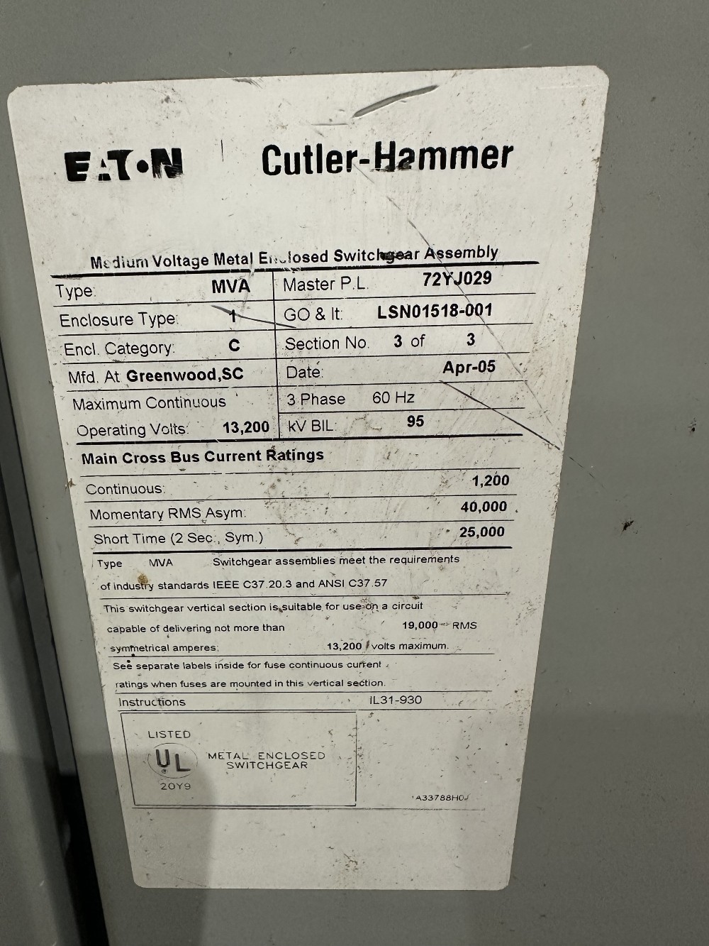 SKU: 134998, Year: 2007, Condition: Used, S/N: J1839-1, Electrical :, Amps: 1200 amps, Voltage: 13800 volts, Phase: 3-phase, Dimensions: 85.00 (H) x 54.00 (W) x 60.00 (L) inches, Additional :, kA: 37, Hz: 60, Pole: 3, Enclosure: NEMA 3, 15kv.
