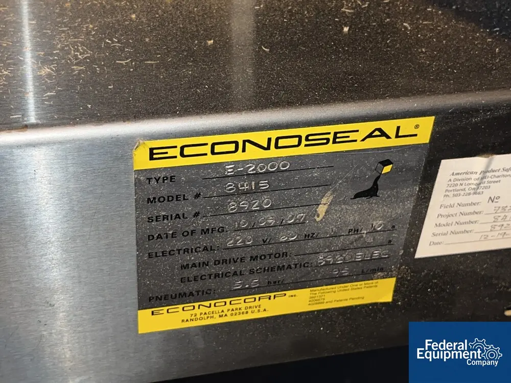 Used Econocorp cartoner, type E 2000, model 8415, speeds up to 1,500 cartons/hour, 1" x 0.75" x 2.5" min carton size, to 12" x 4" x 12" max carton size range, side loading, 220 volt, serial# 8920, built 2007.
