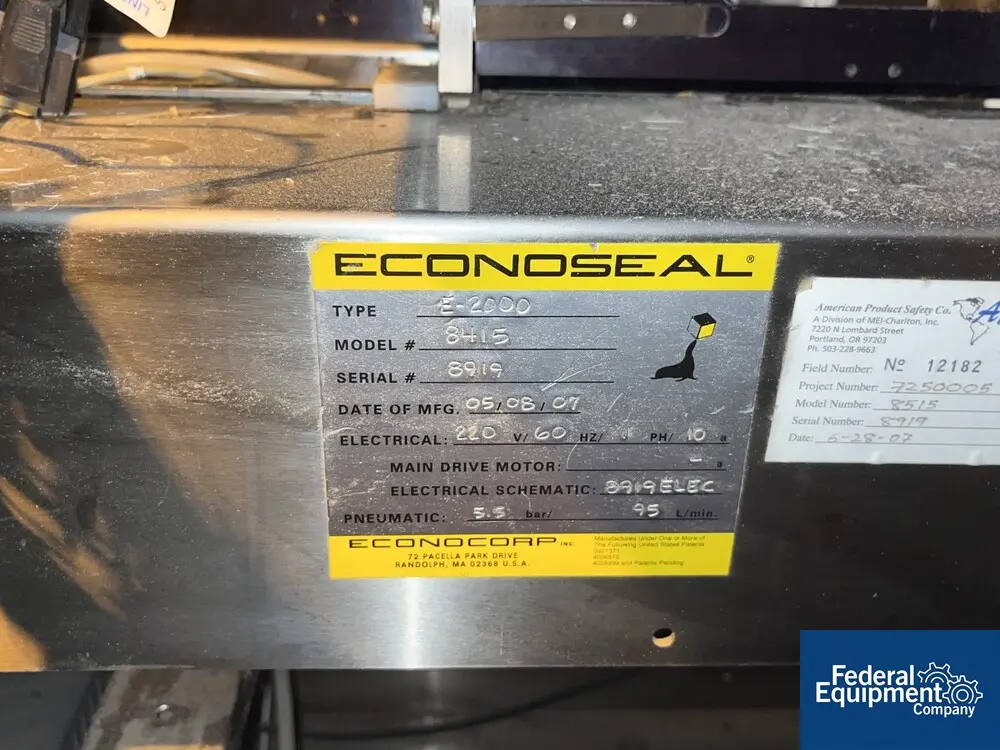Used Econocorp cartoner, type E 2000, model 8415, speeds up to 1,500 cartons/hour, 1" x 0.75" x 2.5" min carton size, to 12" x 4" x 12" max carton size range, side loading, 220 volt, serial# 8919, built 2007.