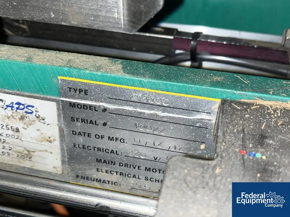 Used Econocorp cartoner, type E 2000, model 9372, speeds up to 1,500 cartons/hour, 1" x 0.75" x 2.5" min carton size, to 12" x 4" x 12" max carton size range, side loading, 220 volt, serial# 10022, built 2012.