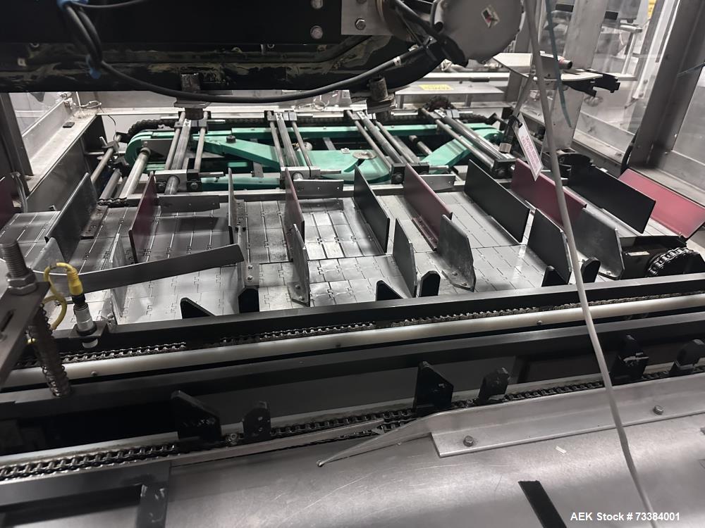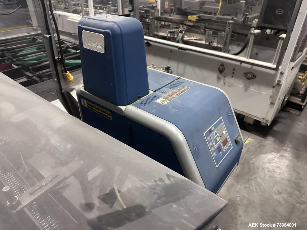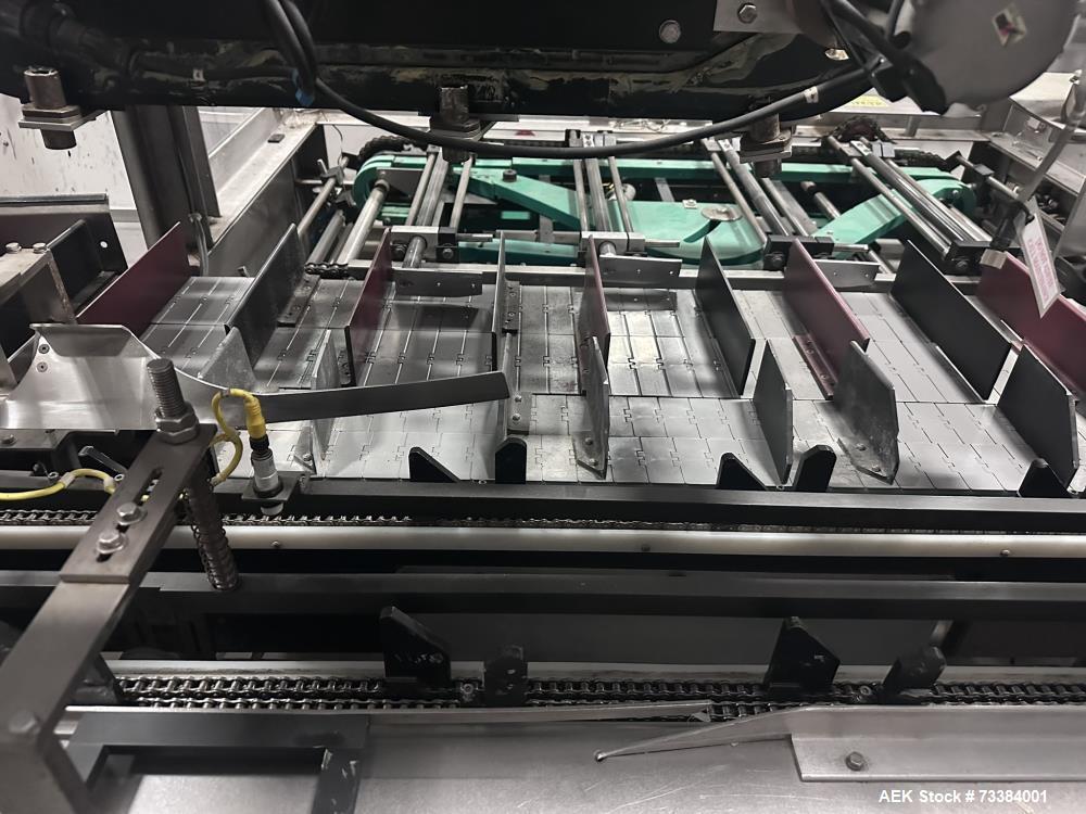 used- econocorp horizontal cartoner with top confiner and glue closure, model pegasus. machine is capable of speeds up to 120 cartons per minute (depending on carton style). two head rotary carton feed with carton pre-break. horizontal powered carton magazine. carton size range: 2" - 8" length x 1" - 3" width x 4" - 12" depth. four chain carton transport with 12" centers. has adjustable bucket infeed. nordson hot melt glue system. allen-bradley micrologix controller. built in 2014.