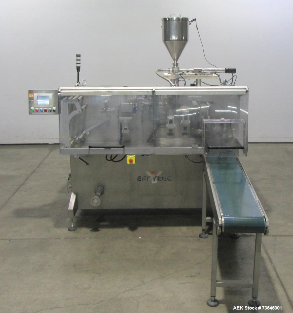 used effytec horizontal form, fill and seal pouch sealing machine, model hb 101. unit is rated for speeds up to 110 cycles per minute. pouch size range: width 40 mm - 100 mm, height 40 mm - 130 mm. maximum volume 50cc. has omron nx-ecc202 plc, (3) omron mx2 inverter drives, color touchscreen hmi. stainless steel construction. 3/60/480v.
