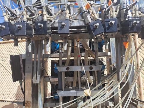 used elmar 36 station filler turret with fowler zalkin 16 head pick and place" capping turret complete with infeed timing screw, infeed starwheel, intermediate transfer starwheel and discharge starwheel all mounted on a monoblock main base with the following: 3-3/4" diameter super extended cylinders (max fill range 67 ...more