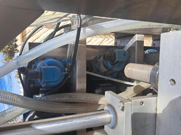 Busse / Arrowhead Systems, model 8′ x 20′ warmer, conveyor style spray bottle warmer. a 18" wide x 150" long infeed conveyor, 94" wide x 250" long conveyor thru tunnel with a 19" high aperture, (22) spray nozzels supplied by a 10 HP Paco centrifugal pump with a 7¼" ...more