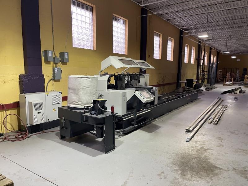 ELUMATEC DG 244 Twin Head Double Miter Saw For Window Profile Fabrication - 6 Meter+ ELUMATEC EP 124 Corner Crimper + ELUMATEC AS 70 Copy RouterCNC double-head miter saw with Elumatec reliable principle “Cutting from below"; provides unhindered access to support table with a large saw blade diameter and optimal use of the saw blade offers an ideal cutting capacity for all cutting variations.External dimension cuts at all angle positions. This means no length calculations are necessary when cutting profiles of different heights. The universal pivoting and tilting of both saw units allow cutting of high and wide profiles as well as every type of compound miter. Consequently, many profiles can be cut without support blocks.External-dimension cuts are possible for all cutting variations. Consequently, no complicated length calculations are necessary.This Offering Includes [3] Machines: ● ELUMATEC DG 244 Twin Head Double Miter Saw ● ELUMATEC EP 124 Corner Crimper ● ELUMATEC AS 70 Copy Router ● ELUMATEC DG 244 Twin Head Double Miter SawSpecifications: Cutting bed length: 6000 mm (19.7')Min. cutting length at 90: 375 mm (13-3/4")Min. cutting length tilted at 45: 375 mmPivoting range inwards: 90 - 45 (up to 22.5 manual with digital display)Tilting range inwards pneumatically: 90 - 45Saw blade diameter: 550 mmSaw blade speed: 2,250 RPMPower output per motor: 4 kW (5.5 HP)Compressed air supply: 7 bar (95 PSI)Features: Capability for series production as well as for special applicationsUniversal pivoting and tilting of both saw units allows cutting of high and wide profiles as well as every type of compound miterExternal-dimension cuts are possible for all cutting variants. Consequently, no complicated length calculations are necessaryPivoting range with digital angle displaySafety hoodsEquipped with digital display as standardPulsed coolant systemHydro-pneumatic saw feedAdvanced E555 (Windows) Computer(2) Vertical Pneumatic ClampsUninterruptible Power SupplyWorkpiece Support - MoveableChip Extraction System CompleteTransformer● ELUMATEC EP 124 Corner CrimperSpecifications:Pressing height 140 mmPressing force 70 kN (7 t)Pneumatic driveCompressed air supply: 7 barAir consumption per working cycle 35 lDimensions: 1100 x 950 x 1230 mmWeight: 545 kGFeatures:For pressing profiles with large dimensions with the highest quality requirementsEasy to adjust and operate and has short changeover times Extremely high pressing force due to large-volume bellows cylinder (maintenance free)With retractable, hydro-pneumatically controlled counter bearingThe specially-designed counter bearing head allows the pressing of frames with an inner dimension starting at 150 mm (clear dimension)The pressing depth can be set separately for each tool carriageAn adjustable pressing blade is also available to compensate for the profile chamber offset (-5 to 15 mm as standard, 15 to 35 mm as an option)Support arms and pressing blades are included as